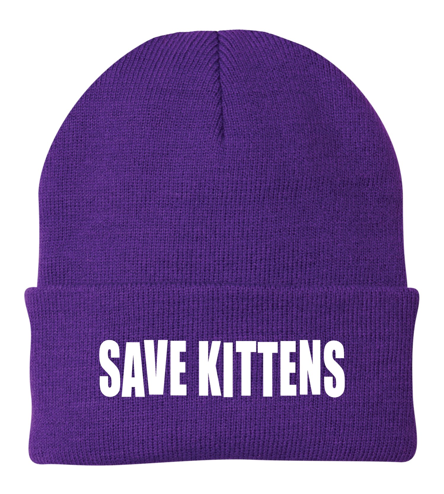 A super cozy one-size-fits-all purple beanie embroidered with the words SAVE KITTENS. This is a seasonal item for winter 2023!